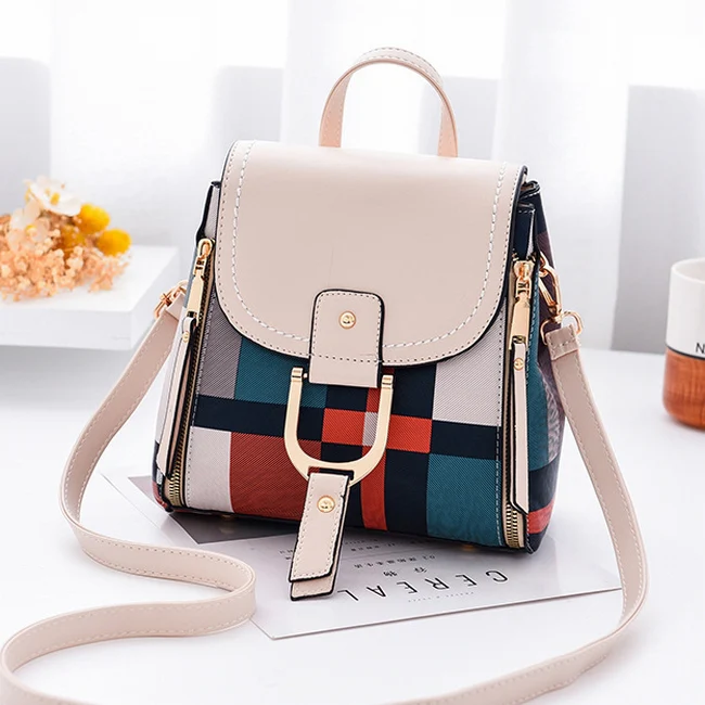 El modelo Arely es un bolso de estilo mochila. Diseño estampado con cuadros de colores y gran hebilla dorada. Dimensiones: 22×20 cm