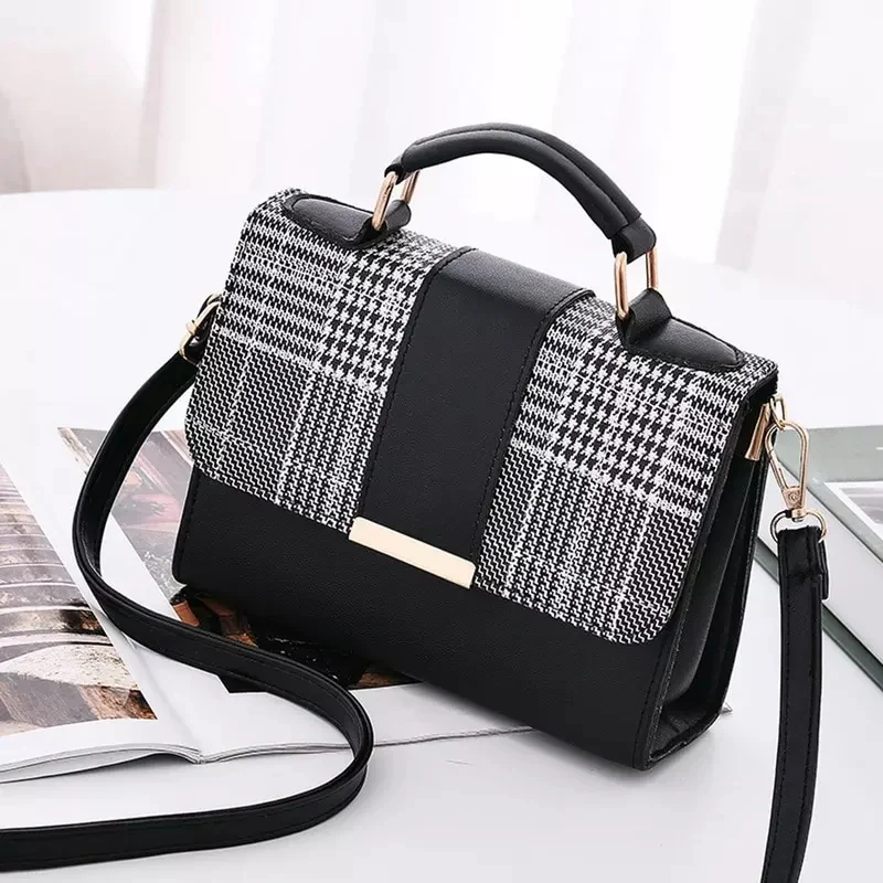 El modelo Tavia es un bolso con asa y correa, liso o estampado de cuadros. Tiene un tamaño de 20 x 15 centímetros