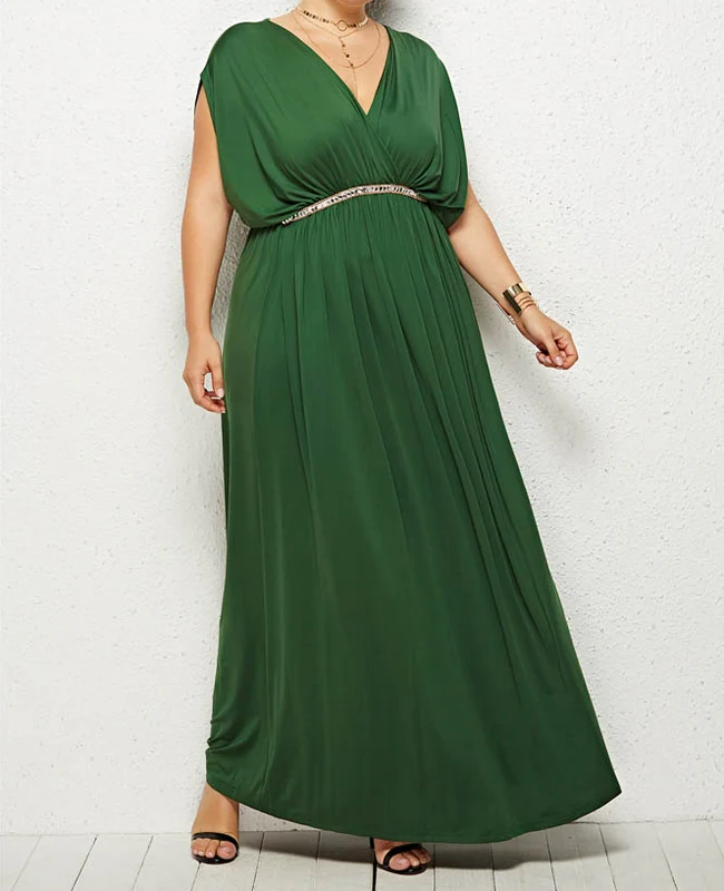 El modelo Idaira es un vestido largo para talla grande de manga corta. Diseño con escote cruzado y decoración en cintura